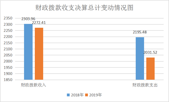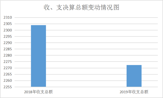 2019年度部门收支总额2272.41万元,与2018年相比,收入总计减少31.56万元、减少1.37%。主要变动原因是本年人员退休及项目支出减少。