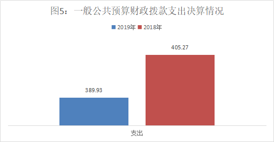 2019年一般公共预算财政拨款支出389.93万元,占本年支出合计的100%。与2018年相比,一般公共预算财政拨款减少15.35万元,下降3.79%。主要变动原因是2019年在职人员减少。