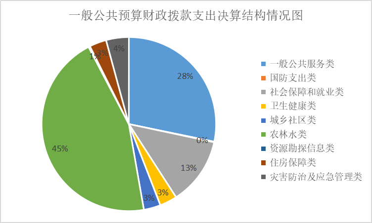 2019年一般公共预算财政拨款支出736.86万元,主要用于以下方面:一般公共服务(类)支出208.14万元,占28.25%;国防(类)支出0.8万元,占0.11%;社会保障和就业(类)支出92.41万元,占12.54%;卫生健康(类)支出23.76万元,占3.22%;城乡社区(类)支出23万元,占3.12%;农林水(类)支出332.49万元,占45.12%;资源勘探信息等(类)支出2万元,占0.27%;住房保障(类)支出23.25万元,占3.16%;灾害防治及应急管理(类)支出31万元,占4.21%。