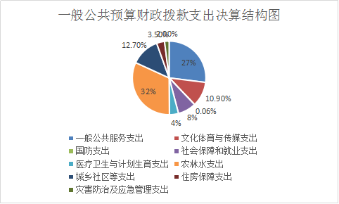 2019年一般公共预算财政拨款支出1195.3万元,主要用于以下方面:一般公共服务(类)支出318.5万元,占27%;文化体育与传媒(类)支出130.68万元,占10.9%;国防(类)支出0.8万元,占0.06%;社会保障和就业(类)支出95.16万元,占8%;医疗卫生与计划生育(类)支出52.04万元,占4%;农林水(类)支出382.50万元,占32%;城镇社区(类)等支出151.40万元,占12.7%;住房保障(类)支出41.81万元,占3.5%,灾害防治及应急管理(类)支出22.41万元,占1.9%