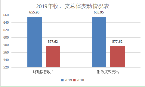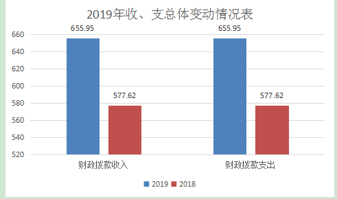 2019年总工会收、支总计655.95万元。与2018年相比,收、支总计各增加78.33万元、增长13.56%;主要变动原因是市财政下达第三批大学生创新创业示范俱乐部(示范园)补助50万元、补发2018年目标奖7.2万元、2018年县级劳模生活补助及工资调资津补贴21.13万元。(图4:财政拨款收、支决算总体变动情况)(柱状图)