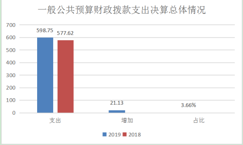 2019年一般公共预算财政拨款支出598.75万元,占本年支出合计的100%。与2018年相比,一般公共预算财政拨款增加21.13万元,增长3.66%。主要变动原因是县级劳模生活补助、人员工资清算及津补贴((图5:一般公共预算财政拨款支出决算变动情况)(柱状图)