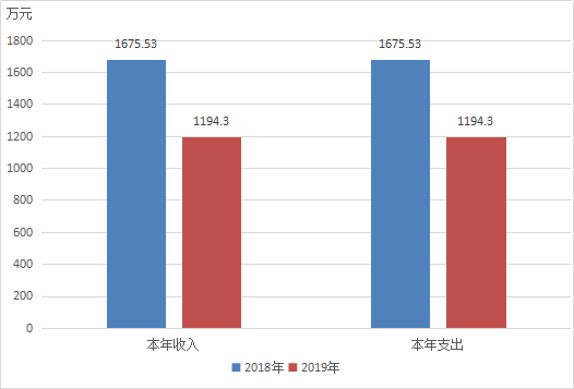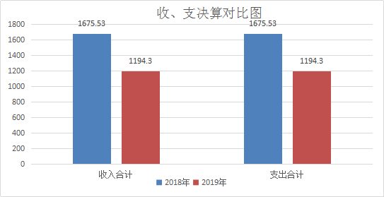2019年度收、支总计1194.3万元。与2018年相比,收、支总计各减少481.23万元,下降28.72%。主要变动原因是项目减少,项目支出减少。