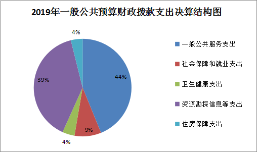 2019年一般公共预算财政拨款支出845.17万元,主要用于以下方面:一般公共服务(类)支出370.63万元,占43.86%;社会保障和就业(类)支出74.48万元,占8.81%;卫生健康支出(类)34.27万元,占4.05%;资源勘探信息等支出(类)333万元,占39.4%;住房保障支出(类)32.78万元,占3.88%。