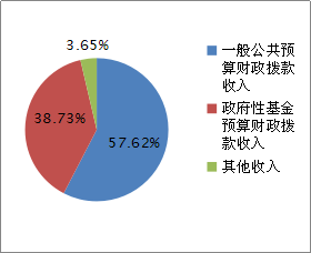 2019年本年收入合计468.84万元,其中:一般公共预算财政拨款收入270.13万元,占57.62%;政府性基金预算财政拨款收入181.59万元,占38.73%;其他收入17.12万元,占3.65%。