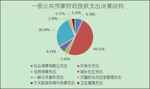 2019年一般公共预算财政拨款支出1128.38万元,主要用于以下方面:一般公共服务(类)支出319.18万元,占28.29%;文化旅游体育与传媒(类)支出1.94万元,占0.17%;社会保障和就业(类)支出76.55万元,占6.78%;卫生健康(类)支出35.02万元,占3.10%;城乡社区(类)支出71.57万元,占6.34%;农林水(类)支出558.59万元,占49.51%;住房保障(类)支出38.53万元,占3.42%。灾害防治及应急管理(类)支出27万元,占2.39%。