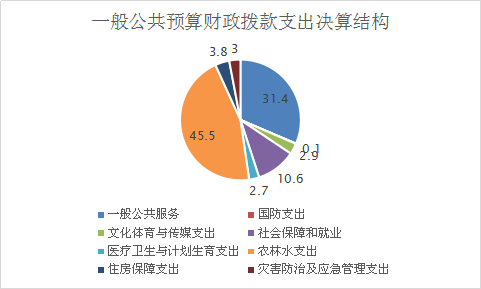 2019年一般公共预算财政拨款支出581.22万元,主要用于以下方面:一般公共服务(类)支出182.66万元,占31.4%;国防支出(类)0.40万元,占0.1%;文化旅游体育与传媒支出(类)支出16.96万元,占2.9%;社会保障和就业(类)支出61.55万元,占10.6%;卫生健康支出(类)15.63万元,占2.7%;农林水支出(类)264.39万元,占45.5%;住房保障支出(类)22.14万元,占3.8%。灾害防治及应急管理支出(类)17.50万元,占3%。
