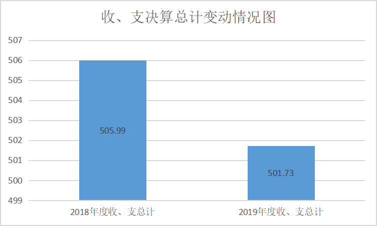 2019年度收、支总计501.73万元。与2018年相比,收、支总计各减少4.26万元,下降0.84%。主要变动原因是单位实有人数变动。