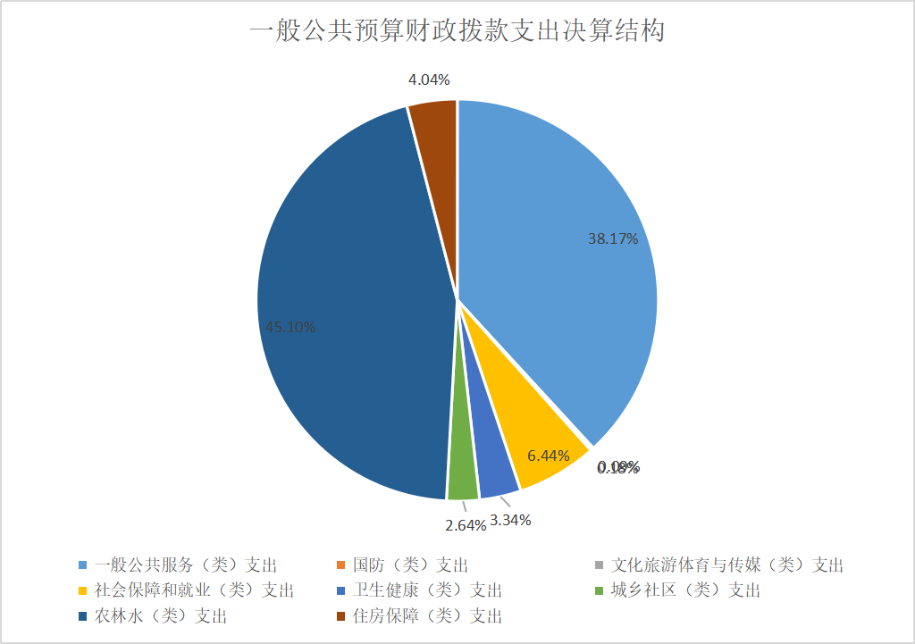 2019年一般公共预算财政拨款支出462.72万元,主要用于以下方面:一般公共服务(类)支出176.62万元,占38.17%;国防(类)支出0.4万元,占0.09%;文化旅游体育与传媒(类)支出0.83万元,占0.18%;社会保障和就业(类)支出29.78万元,占6.44%;卫生健康(类)支出15.48万元,占3.34%;城乡社区(类)支出12.2万元,占2.64%;农林水(类)支出208.71万元,占45.10%;住房保障(类)支出18.7万元,占4.04%。