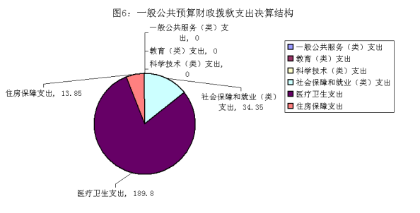 2019年一般公共预算财政拨款支出238.05万元,主要用于以下方面:一般公共服务(类)支出0万元,占0%;教育(类)支出0万元,占0%;科学技术(类)支出0万元,占0%;社会保障和就业(类)支出34.35万元,占14.43%;医疗卫生支出189.8万元,占79.75%;住房保障支出13.85万元,占5.82%。