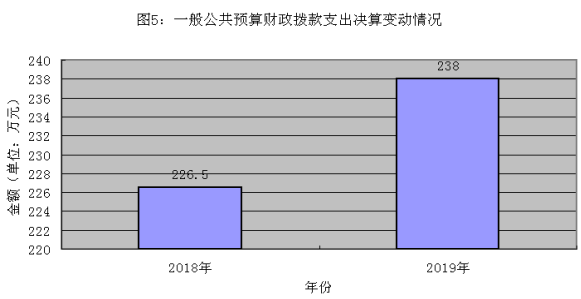 2019年一般公共预算财政拨款支出238.05万元,占本年支出合计的100%。与2018年相比,一般公共预算财政拨款增加11.58万元,增长5.11%。主要变动原因是人员经费增加,同时为更好开展工作公业务费增加。
