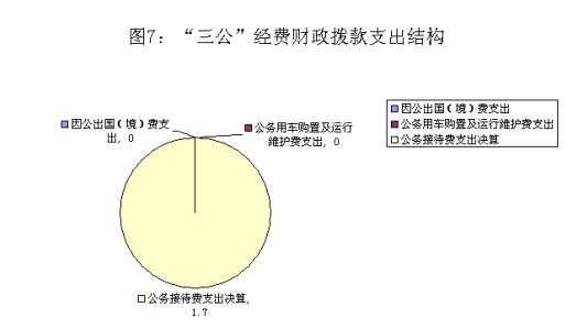 2019年“三公”经费财政拨款支出决算中,因公出国(境)费支出决算0万元,占0%;公务用车购置及运行维护费支出决算0万元,占0%;公务接待费支出决算1.7万元,占100%。具体情况如下: