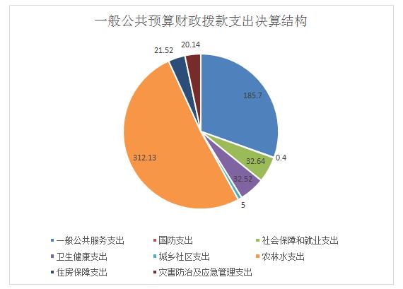 2019年一般公共预算财政拨款支出610.06万元,主要用于以下方面:一般公共服务(类)支出185.7万元,占30.44%;国防(类)支出0.4万元,占0.06%;社会保障和就业(类)支出32.64万元,占5.35%;卫生健康(类)支出32.52万元,占5.33%;城乡社区(类)支出5万元,占0.82%;农林水(类)支出312.13万元,占51.16%;住房保障(类)支出21.52万元,占3.54%;灾害防治及应急管理(类)支出20.14万元,占3.3%。
