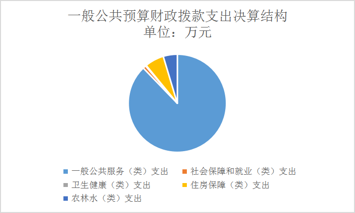 2019年一般公共预算财政拨款支出2326.61万元,主要用于以下方面:一般公共服务(类)支出286.74万元,占12.32%;社会保障和就业(类)支出3.28万元,占0.14%;卫生健康(类)支出0.94万元,占0.04%;住房保障(类)支出20.54万元,占0.88%;农林水(类)支出15.12万元,占0.65%。