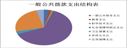 2019年一般公共预算财政拨款支出3,756.88万元,主要用于以下方面:一般公共服务(类)支出104.37万元,占2.78%;教育支出(类)62.71万元,占1.67%;科学技术(类)支出37.48万元,占1%;社会保障和就业(类)支出2381.21万元,占63.38%;卫生健康支出99.33万元,占2.64%;农林水支出915.67万元,占24.37%;住房保障支出156.11万元,占4.16%。