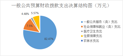 2019年一般公共预算财政拨款支出603.25万元,主要用于以下方面:一般公共服务(类)支出497.66万元,占82.47%;社会保障和就业(类)支出44.97万元,占7.5%;卫生健康支出27万元,占4.48%;住房保障支出33.63万元,占5.57%。