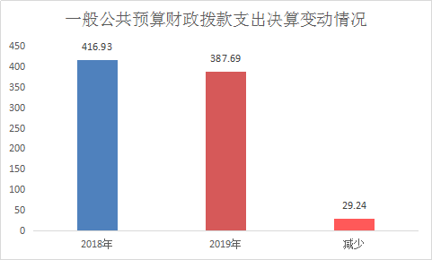 2019年一般公共预算财政拨款支出387.69万元,占本年支出合计的100%。与2018年相比,一般公共预算财政拨款减少29.24万元,下降7.01%。主要变动原因是项目减少和厉行节约。