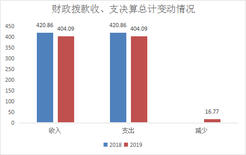 2019年财政拨款收、支总计404.09万元。与2018年相比,财政拨款收、支总计各减少16.77万元,下降3.98%。主要变动原因是项目减少和厉行节约。