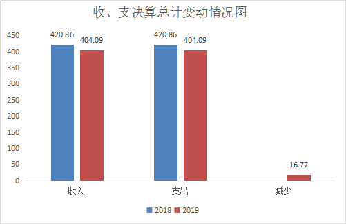 2019年度收、支总计404.09万元。与2018年相比,收、支总计各减少16.77万元,下降3.98%。主要变动原因是项目减少和厉行节约。