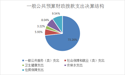 2019年一般公共预算财政拨款支出387.69万元,主要用于以下方面:一般公共服务(类)支出284.01万元,占73.26%;社会保障和就业(类)支出23.00万元,占5.93%;卫生健康支出12.50万元,占3.22%;农林水支出31.18万元,占8.04%;住房保障支出37.00万元,占9.54%。
