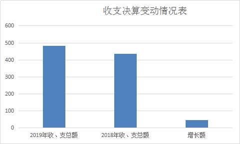 2019年度收、支总计482.39万元。与2018年相比,收、支总计各增加435.76万元,增加9.6%。主要变动原因人员增加,专项资金增加。
