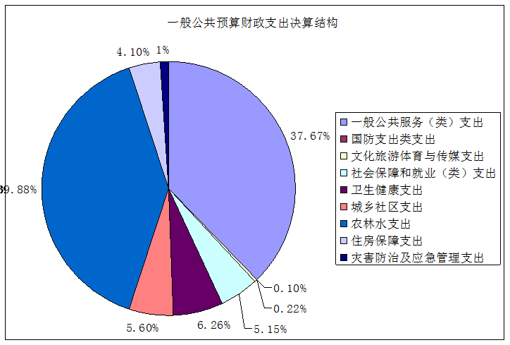 2019年一般公共预算财政拨款支出411.28万元,主要用于以下方面:一般公共服务(类)支出154.91万元,占37.67%;国防支出类支出0.4万元,占0.097%;文化旅游体育与传媒支出0.9万元,占0.22%;社会保障和就业(类)支出21.17万元,占5.15%;卫生健康支出25.76万元,占6.26%;城乡社区支出23.05万元,占5.6%;农林水支出164.01万元,占39.88%;住房保障支出16.91万元,占4.1%;灾害防治及应急管理支出4.17万元,占1%。