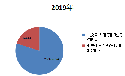 2019年本年收入合计31466.54万元,其中:一般公共预算财政拨款收入25166.54万元,占80%;政府性基金预算财政拨款收入6,300.00万元,占20%。