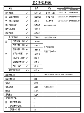2.二期全部建设完成后综合经济技术指标为:总用地面积78311.437㎡(其中现状用地面积73660.037㎡,待征用地面积4651.40㎡)。总建筑面积83656.51㎡(其中地上建筑面积77346.51㎡、地下建筑面积6310㎡);规划班数76个,规划人数3800人,容积率0.972,可比容积率1.328,绿地率35.12%,建筑密度20.29%,停车位192辆。(附图见后)