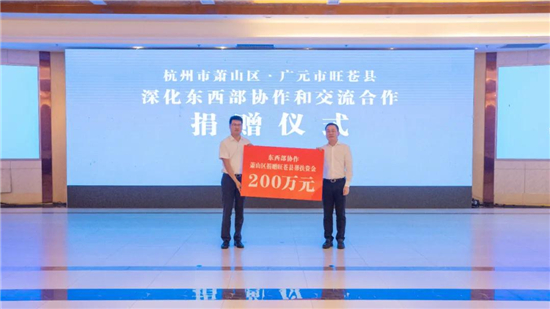 在萧山区—旺苍县东西部协作工作第二次联席会上,与会人员观看了杭州市萧山区宣传片,签订了杭州市萧山区—广元市旺苍县东西部协作和交流合作框架协议,举行了萧山区政府向旺苍县政府资金捐赠仪式。