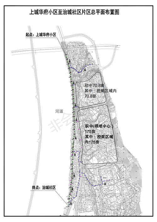 该项目位于东河镇,区域整体地形东北高西南低,污水主管接至现有污水管网,沿河道进行埋设。起点为上城华府小区,终点接入治城小区现有污水检查井。