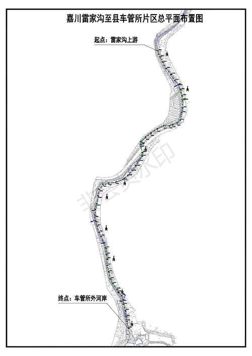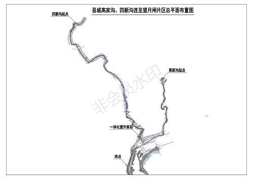 该项目位于嘉川镇,区域整体地形北高南低,污水主管接至现有污水管网,沿河道进行埋设。起点为雷家沟,终点接入车管所现有污水检查井。