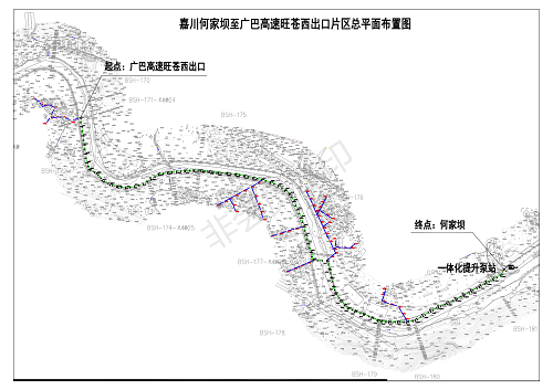 该项目位于旺苍县嘉川镇,区域整体地形西北高东南低,污水主管接至现有污水管网,沿河道进行埋设。起点为广巴高速西出口,终点接入何家坝现有污水检查井。