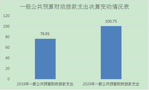2020年一般公共预算财政拨款支出100.75万元,占本年支出合计的100%。与2019年76.91相比,一般公共预算财政拨款增加23.84万元,增长30.98%。主要变动原因是单位合并导致人员经费和业务经费支出增加。