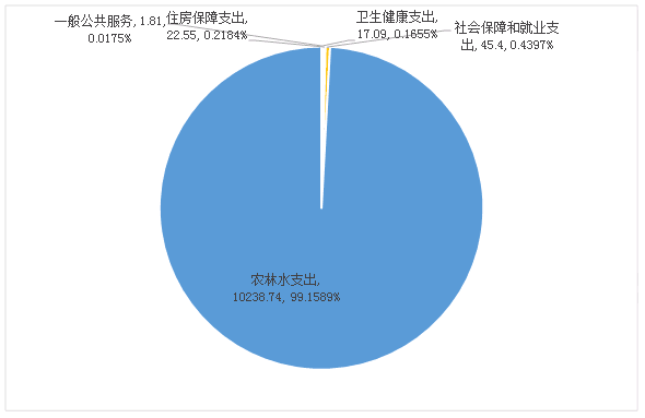 2020年一般公共预算财政拨款支出10325.59万元,主要用于以下方面:一般公共服务(类)支出1.81万元,占0.02%;社会保障和就业支出(类)45.4万元,占0.44%;卫生健康支出(类)17.09万元,占0.16%;农林水支出(类)10238.74万元,占99.16%;住房保障支出(类)22.55万元,占0.22%。