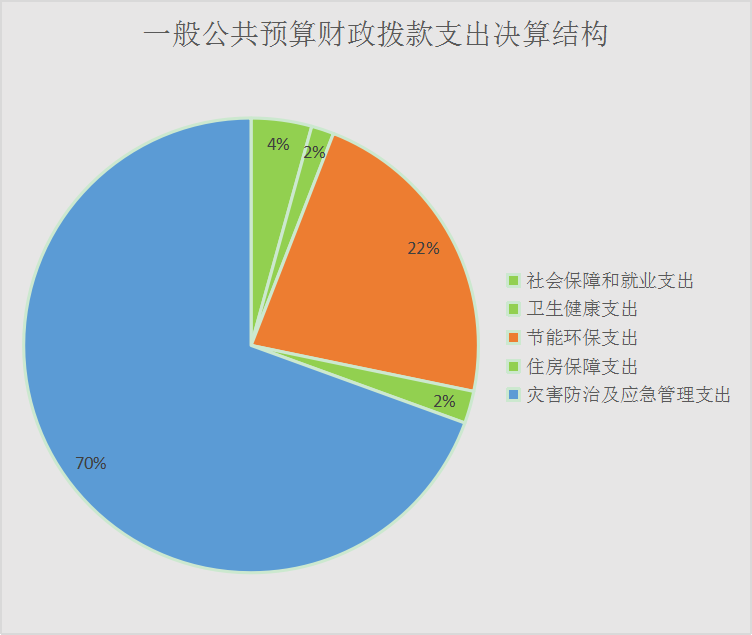 2020年一般公共预算财政拨款支出2618.42万元,主要用于以下方面:社会保障和就业(类)支出112.31万元,占4.3%;卫生健康支出43.1万元,占1.6%;节能环保支出585万元,占22.34%;住房保障支出59.68万元,占2.3%;灾害防治及应急管理支出1818.34万元,占69.46%。