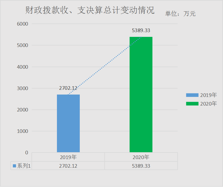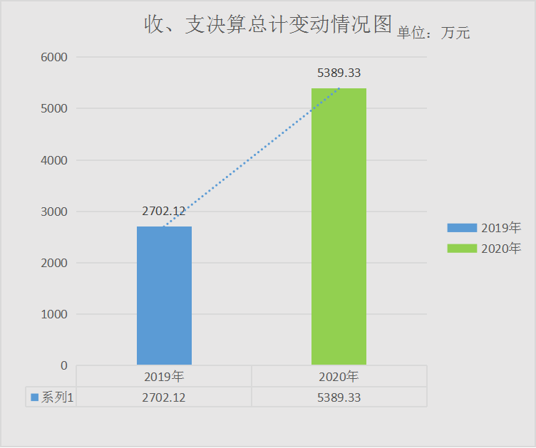 2020年度收、支总计5389.33万元。与2019年相比,收、支总计各增加2687.21万元,增长99.45%。主要变动原因是专项资金增加。