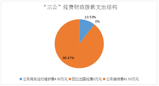 2020年“三公”经费财政拨款支出决算中,因公出国(境)费支出决算0万元,占0%;公务用车购置及运行维护费支出决算4.89万元,占10.53%;公务接待费支出决算41.58万元,占89.47%。具体情况如下: