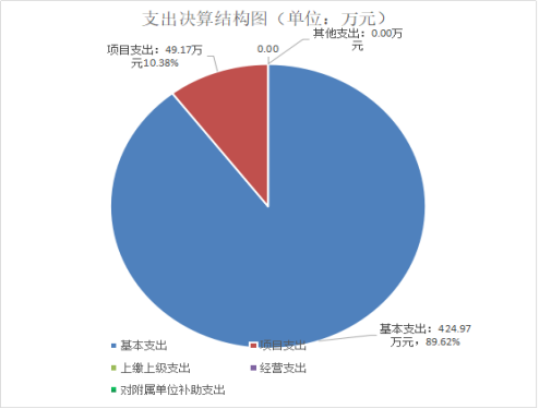 2020年本年支出合计474.17万元,其中:基本支出424.97万元,占89.62%;项目支出49.19万元,占10.38%;上缴上级支出0万元,占0%;经营支出0万元,占0%;对附属单位补助支出0万元,占0%。