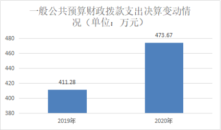 2020年一般公共预算财政拨款支出473.67万元,占本年支出合计的84.73%。与2019年411.28万元相比,一般公共预算财政拨款增加62.39万元,增长15.17%。主要变动原因是区划调整,人员增加。
