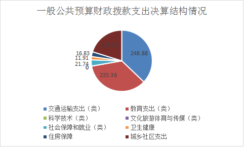 2020年一般公共预算财政拨款支出434.93万元,主要用于以下方面:交通运输支出(类)支出248.88万元,占57.22%;教育支出(类)0万元,占0%;科学技术(类)支出0万元,占0%;文化旅游体育与传媒(类)支出0万元,占0%;社会保障和就业(类)支出21.74万元,占5%;卫生健康支出11.91万元,占2.74%;住房保障支出16.83万元,占3.87%。城乡社区支出(类)135.57万元占31.17%。