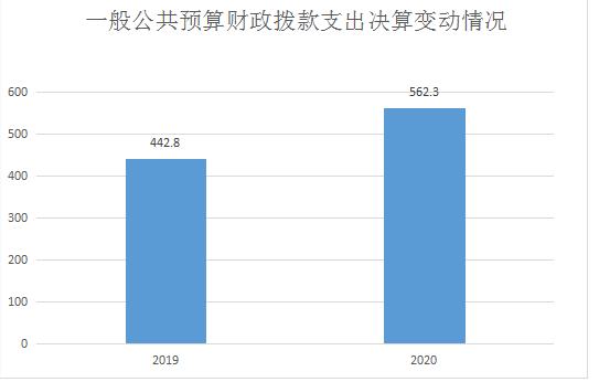 2020年一般公共预算财政拨款支出562.3万元,占本年支出合计的78.8%。与2019年相比,一般公共预算财政拨款支出增加119.5万元,下降26.96%。主要变动原因是人员经费和日常经费增加。