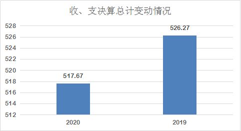 2020年度收、支总计517.67万元。与2019年相比,收、支总计526.27万元减少11.6万元,下降1.63%。主要变动原因是2020年减少有退休人员和调出人员。