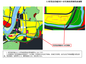 3.旺苍县老城2021-02号地块由农业生产绿地调整为居住用地。经济技术指标为:用地面积:54,404.75㎡、容积率≤3.0、建筑密度≤30%、绿化率≥30%