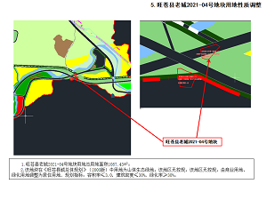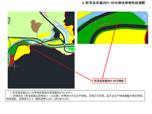 5.旺苍县老城2021-04号地块由商业用地、绿化用地调整为居住用地。经济技术指标为:1087.43㎡、容积率≤3.0、建筑密度≤30%、绿化率≥30%;