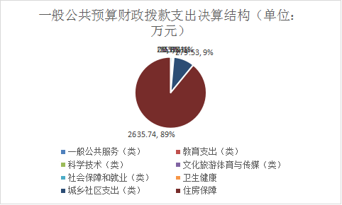 2020年一般公共预算财政拨款支出2958.06万元,主要用于以下方面:一般公共服务(类)支出0.55万元,占0.02%;教育支出(类)0万元,占0%;科学技术(类)支出0万元,占0%;文化旅游体育与传媒(类)支出0万元,占0%;社会保障和就业(类)支出25.39万元,占0.86%;卫生健康支出16.85万元,占0.57%;城乡社区支出(类)支出279.53万元,占9.45%;住房保障支出2635.74万元,占89.10%。