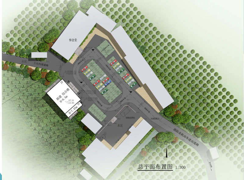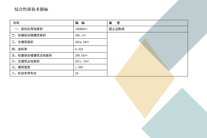 拟建方案经济技术指标为:规划总用地面积190960㎡(国土证数据);总建筑面积4624.34㎡;拟建建筑面积592.1㎡;容积率0.024;总建筑占地面积2071.7㎡;拟建建筑基底面积296.05㎡;建筑密度1.08%;绿地面积--;绿地率--;机动车停车位39个;非机动车位--(松米山公墓及殡仪馆现有的绿地、机动车停车场、非机动车停车位均可满足现在及近期内的使用需求,本项目的实施仅为功能完善需要,不会增加大量的额外使用人数,对殡仪馆的配套需求增量极低,因此相关各项指标忽略不计)。(附图见后)