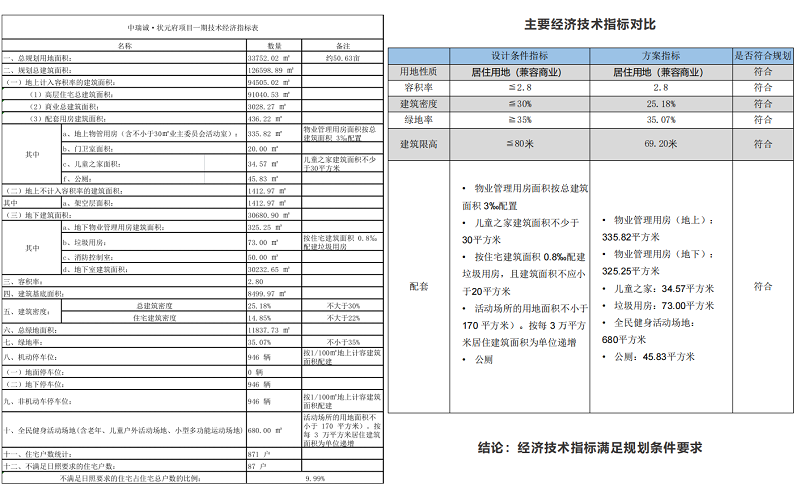 一期项目主要经济技术指标为:总规划用地面积33752.02㎡;规划总建筑面积126598.89㎡;地上计入容积率的建筑面积94505.02㎡,其中高层住宅总建筑面积91040.53㎡,商业总建筑面积3028.27㎡,配套用房建筑面积436.22㎡:a.地上物管用房(含不小于30㎡业主委员会活动室)335.82㎡,b.门卫室面积20.00㎡,C.儿童之家面积34.57㎡,d.公厕45.83㎡;地上不计入容积率的建筑面积1412.97㎡(架空层);地下建筑面积30680.90㎡,其中地下物业管理用房建筑面积325.25㎡,垃圾用房73.00㎡,消防控制室50.00㎡,地下室建筑面积30232.65㎡;容积率2.8;建筑基底面积8499.97㎡;总建筑密度25.18%,其中住宅建筑密度14.85%;总绿地面积11837.73㎡,绿地率35.07%;机动停车位946辆,其中地面停车位0辆,地下停车位946辆;非机动车停车位946辆;全民健身活动场地(含老年户外活动场地、小型多功能运动场地)680㎡;住宅户数统计871户;不满足日照要求的住宅户数87户,占住宅总建筑面积的比例9.99%。