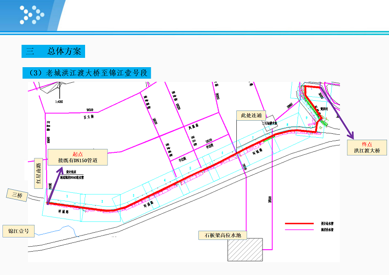 本段管道起点接红星南路既有DN150管道,同时预留将来连通三桥对面管道的接头,终点于洪江渡大桥接既有已调压的DN300管道,途中于建设路同石板梁高位水池既有DN300管道连通,管道全长1697m,管径采用DN300,管道基本沿现有人行道铺设,途中预留给水点并按需设置消火栓,管道采用钢管。