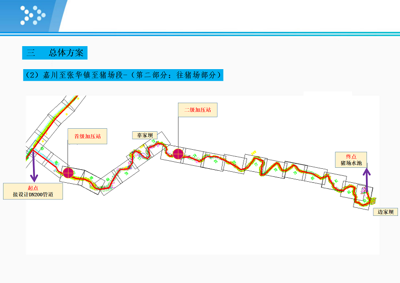 (二)张华镇至猪场段:本段管道起点位于张华镇外旺苍公路桥头,接本次设计嘉川至张华镇段DN200管道,终点位于宋水猪场水池,全长4060m,管径采用DN150-200,管道基本沿现有公路铺设,因起终点落差大,管内水压较大,采用焊接钢管。其中首级加压站位于J0+393,二级加压站位于J1+724,均位于公路旁空地,均采用1500m3/d箱式一体化加压站接力加压供水。