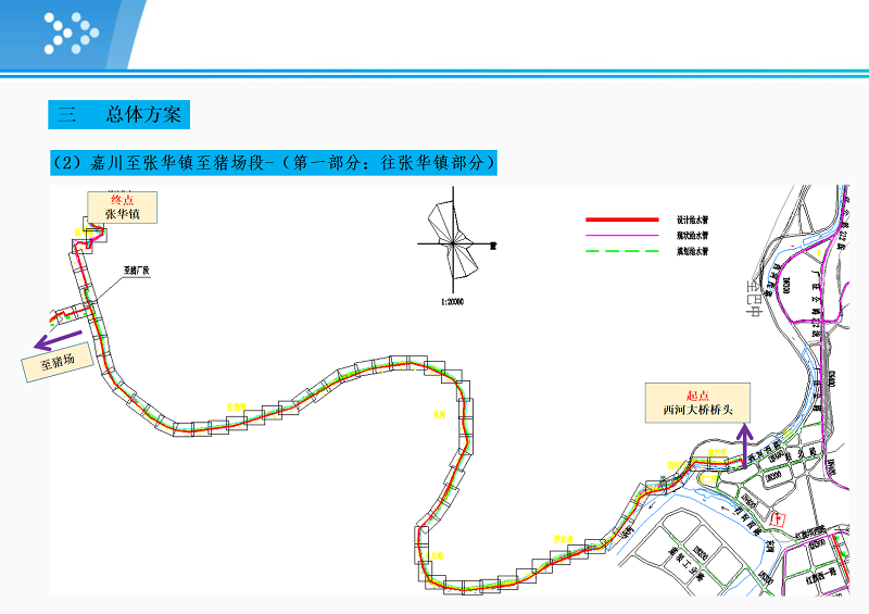 (一)嘉川至张华镇:本段管道起点位于旺苍公路西河大桥桥头,终点位于张华镇,全长11185m,管径采用DN200,管道大部分位于旺苍公路旁边坡顶平台,极小部分需跨越沟渠,因此本段管道大部分采用PE100级聚乙烯管,少部分采用焊接钢管。本段管道铺设位置与方式,已与公路桥梁主管部分协商确认。